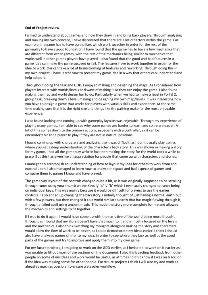 My main focus on the game was trying to make game around magic that allows the player to have the freedom of creating and learning spells on their own. This solo project game allowed me to create a fun magic oriented game. The idea was imoportant to try and make the theoretical combat engaging as well as the down time and exploriation throughout the game. Although this was about creating a concept for a game, it helped me with the production side of creating a game, for example teaching me how to timeline.